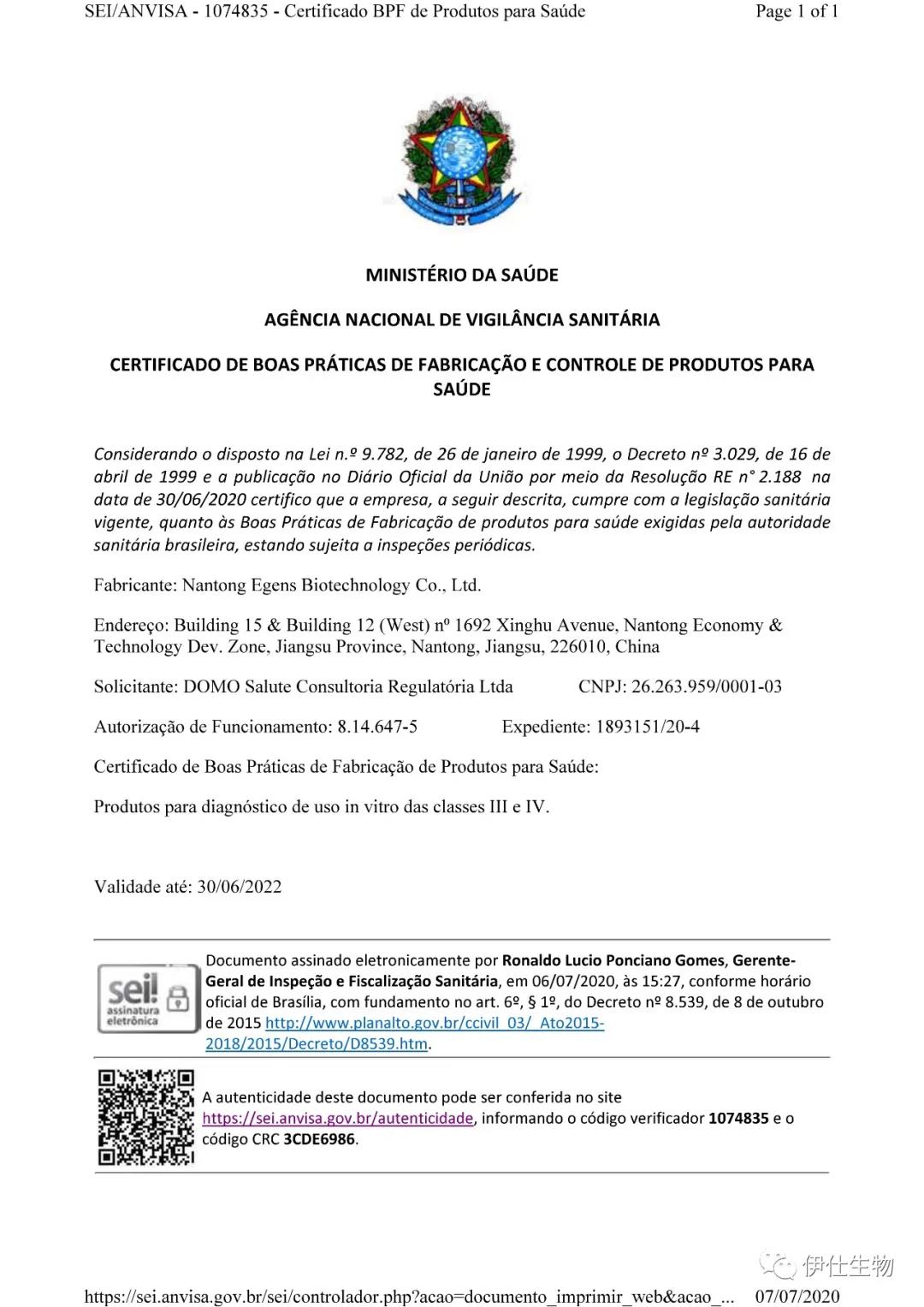 喜訊!伊仕生物新冠病毒抗原檢測試劑獲巴西醫療器械注冊證